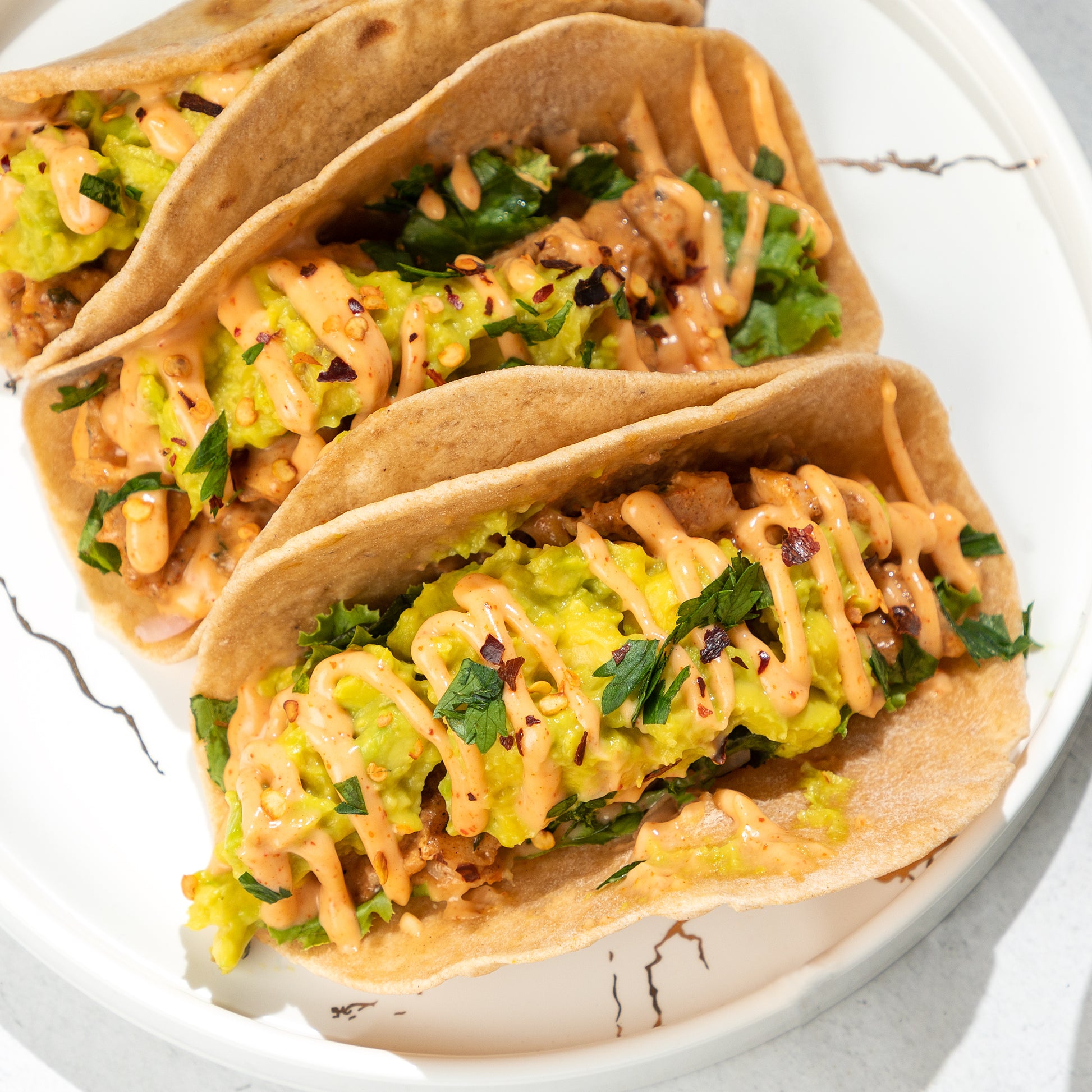 3 taco shell, Chicken breast, Avocado, Pickled onion, cabbage with Sriracha mayo & Fresh parsley