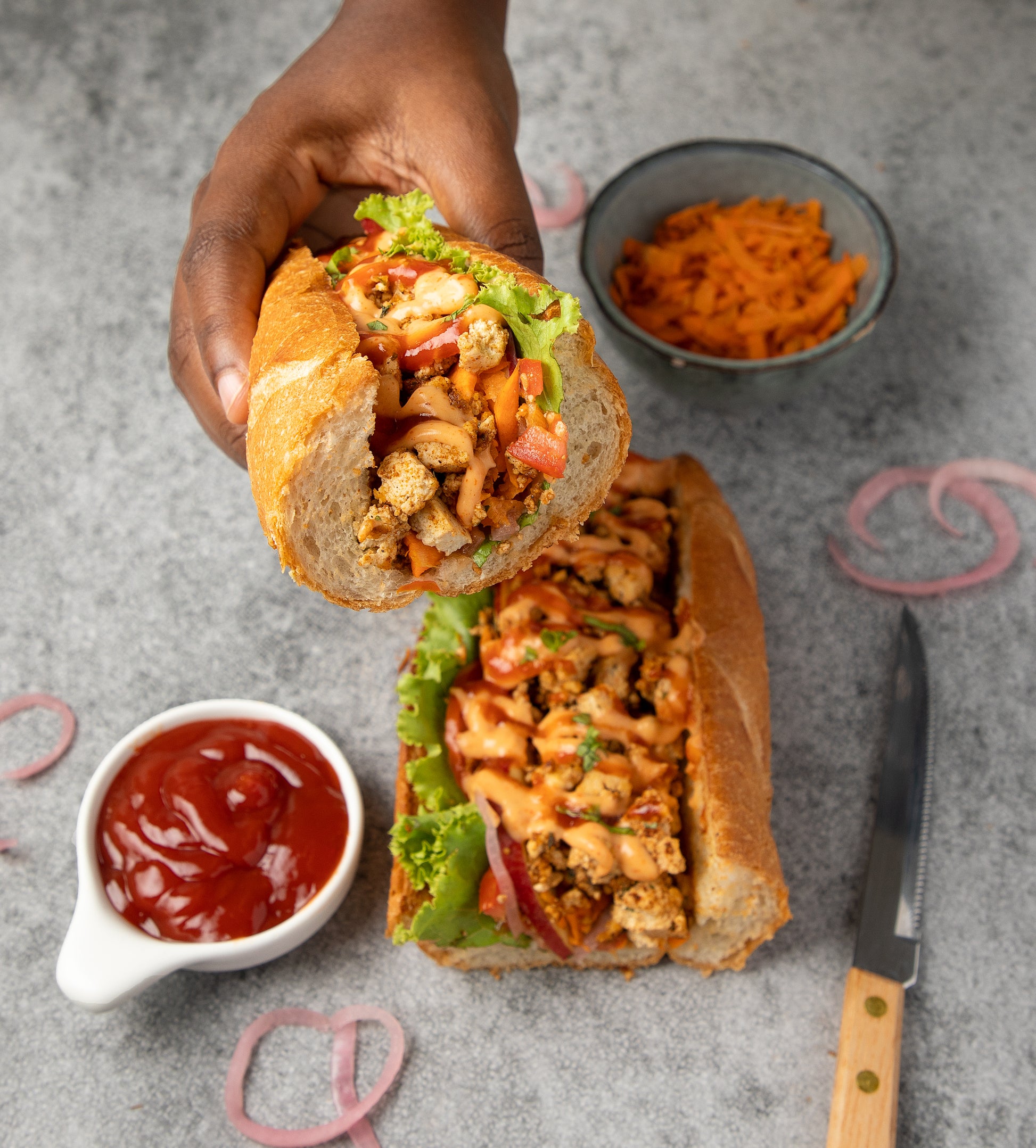 Lettuce, tomato, pickled onion, tofu, carrot & apple with sweet chili and barbecue sauce